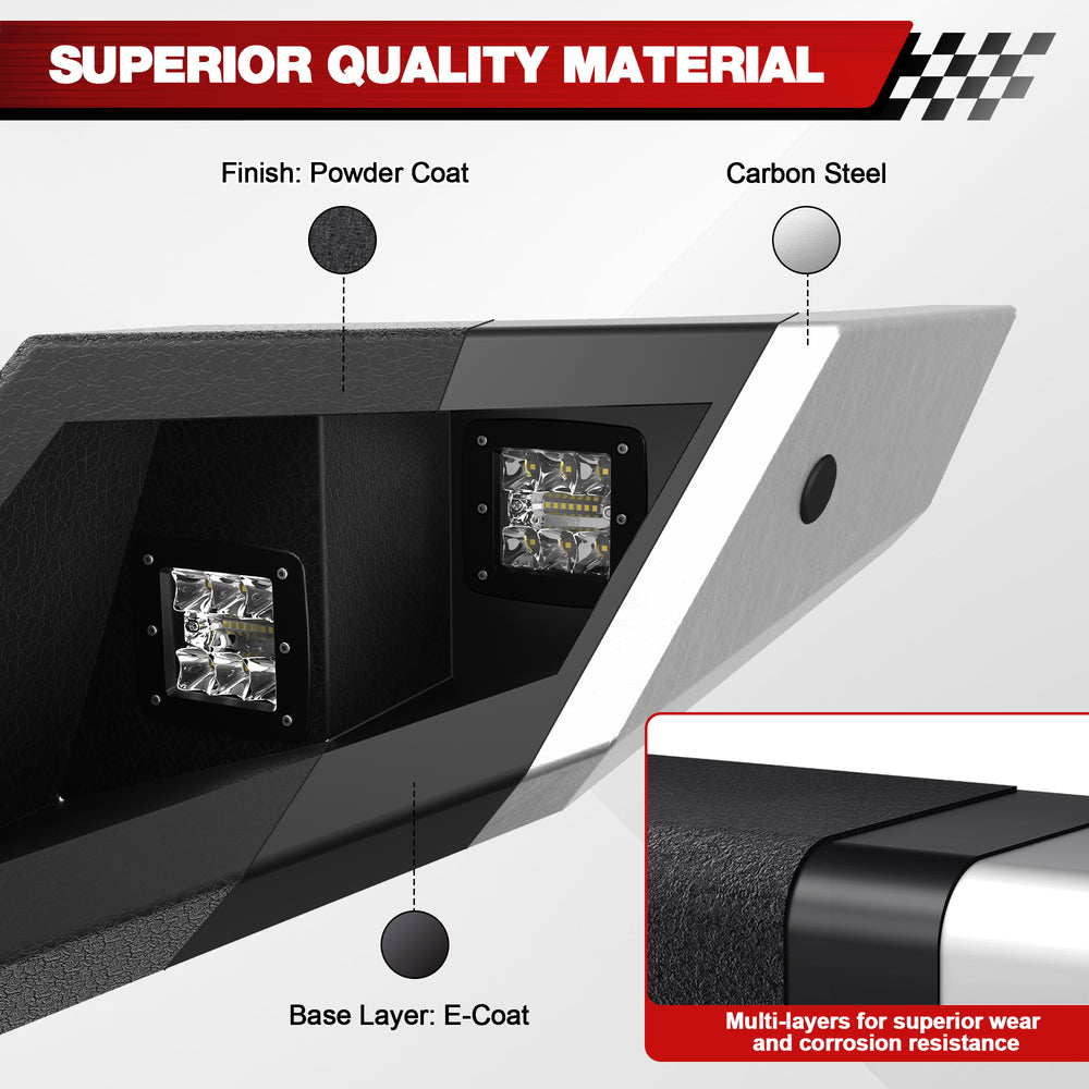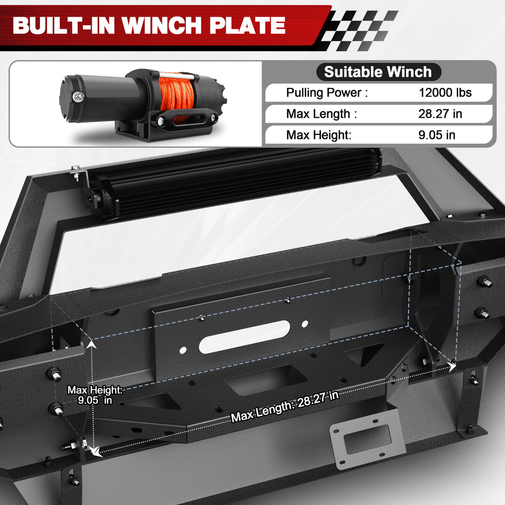 Built-in LED Lighting: The Steel bumper incorporates a 120W light bar and four fog lights, delivering ample brightness for night driving and work. The bright LED enhances the off-road aesthetic, ready for adventure.