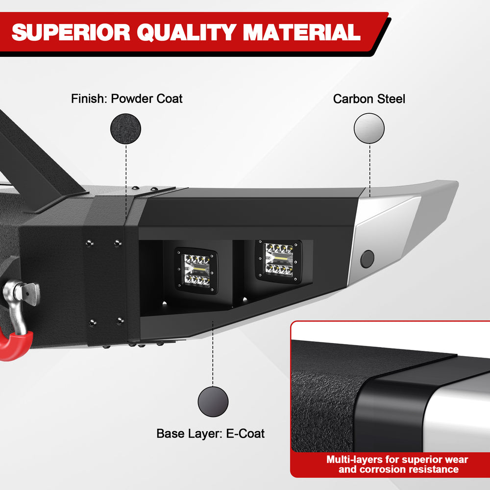 Premium Quality Materials: F250 F350 F450 front bumper is made of high-strength steel for superior durability. With a two-stage textured black powder coating, it offers both style and enhanced protection. It is rust-resistant, ensuring long-lasting performance and aesthetics even if the powder coat gets damaged.