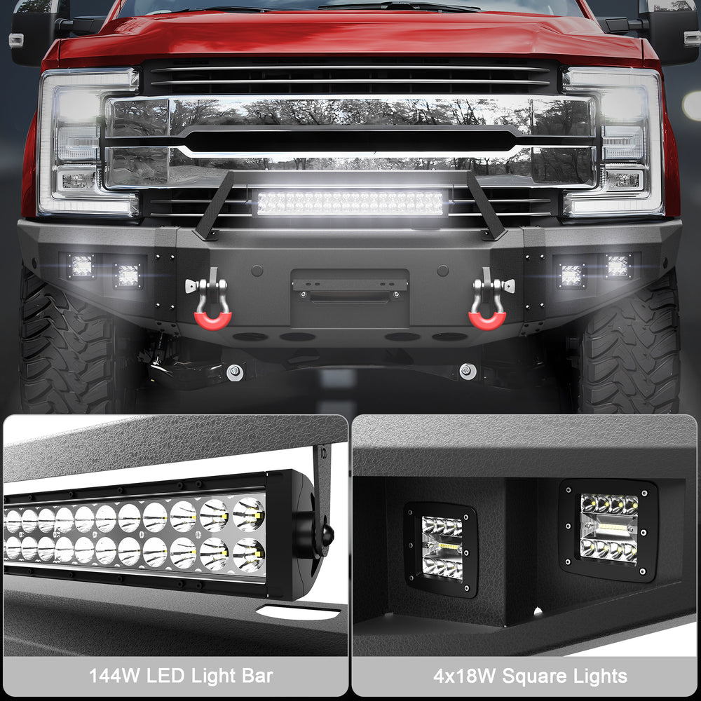 Extremely Bright Light: beautiful and elegant. The F250 Front Bumper is equipped with 1x144W LED aluminum light + 4x24W LED aluminum lights. LED aluminum lights can not only produce visual beauty, but also provide you with lighting and safety on dark roads.