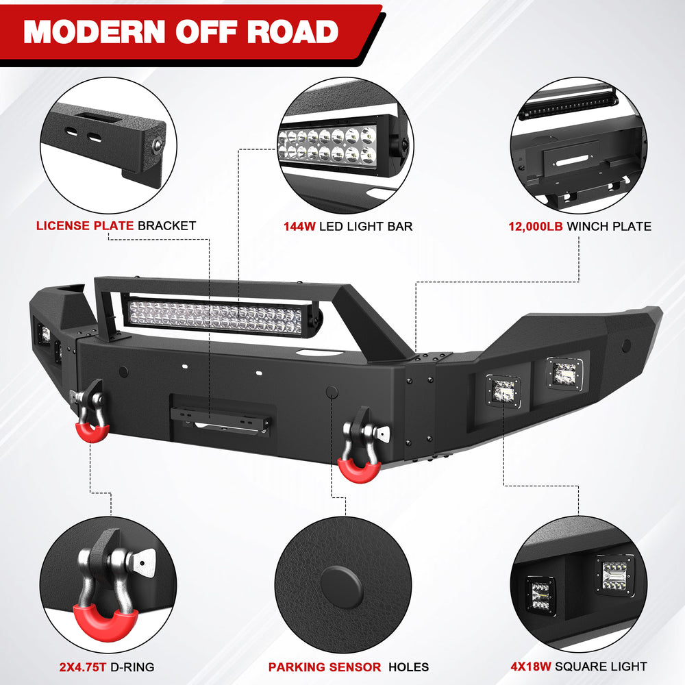 Practical Design: Off-road Bumper comes with a built-in winch plate that can handle up to 12,000 lbs of winch. Pre-cutouts that work with factory tow hooks.
