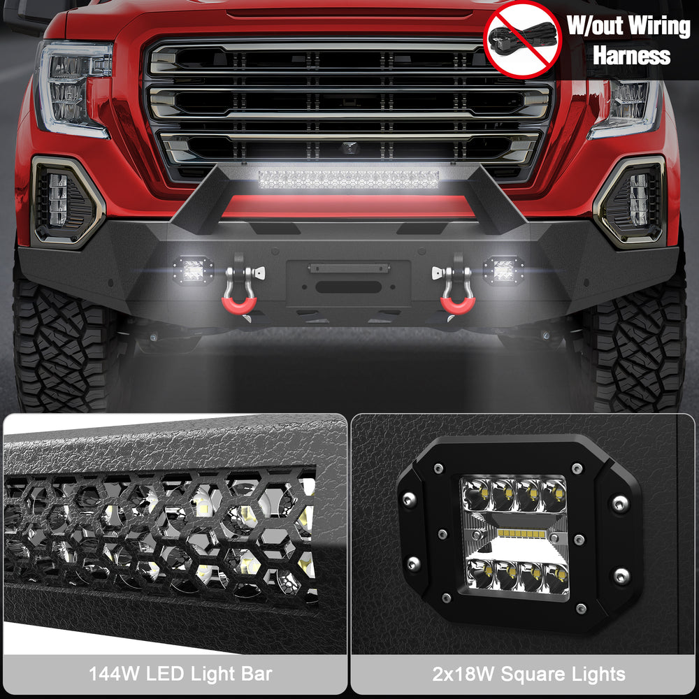 Sierra 1500 Accessories: The Sierra 1500 front bumper comes with a 12,000 lbs winch plate, two 4.75-ton D-rings, a license plate bracket, pre-drilled holes for sensors, a 144W LED spotlight, and two 18W LED spotlights. Complete installation instructions and all necessary screws are provided for an easy setup.