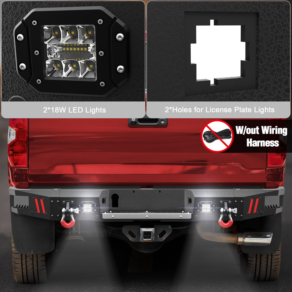Tundra Accessories: The Tundra rear bumper features two 18W LED lights, D-rings, sensor holes, removable elements, and pre-drilled holes for license plate, light, and trailer plug.
