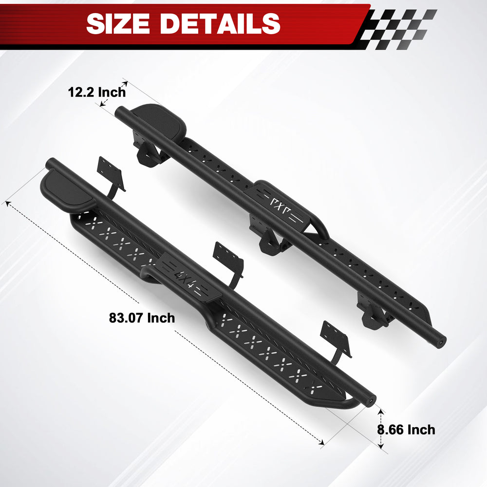 Drill-Free Installation: No cutting or modifications required. Quick and easy installation without damaging your vehicle. The kit includes two side steps, mounting brackets, installation instructions, and all necessary hardware—no additional tools needed.