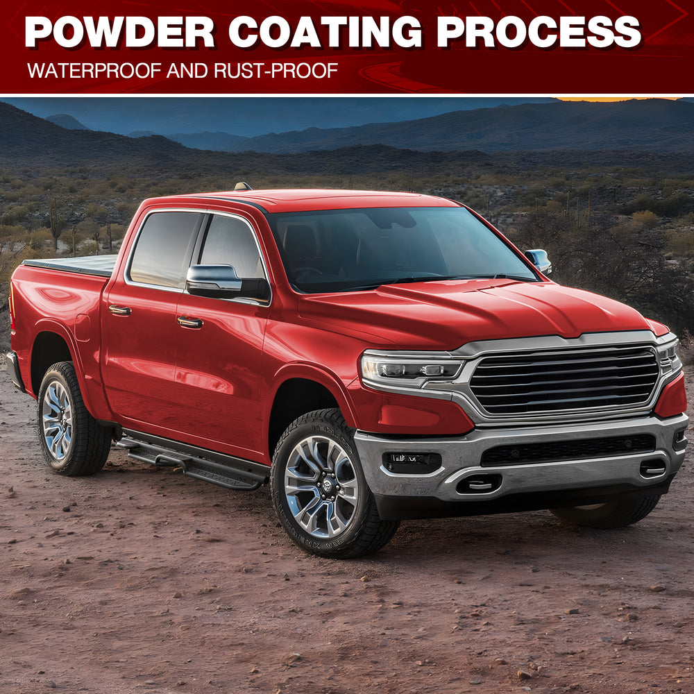 Rust-Resistant Metal Construction: Running boards for Ram 1500 are crafted from heavy-duty carbon steel with a premium black powder coating for superior rust and corrosion resistance. Ideal for rainy, snowy, or coastal environments. Hollow design in the step area ensures secure and stable stepping, prevents water accumulation, and reduces driving resistance.