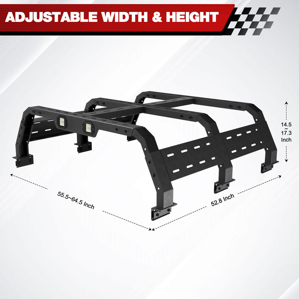 Expandable Heavy Duty Steel Rack: The width and length of the truck bed rack are adjustable; you can expand the width from 55.5" to 64.5" and the height from 14.5" to 17.3", offering ample space for gear while maintaining clearance.